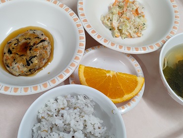 ひじきハンバーグ・サラダ・コンソメスープ・ゆかりご飯・オレンジ