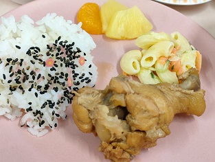 さっぱり煮・マカロニサラダ・ふりかけご飯・コンソメスープ・フルーツ