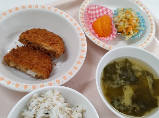 メンチカツ・サラダ・缶みかん・わかめご飯・みそ汁
