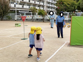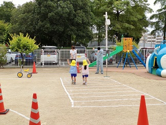 お話を聴いた後で横断歩道の渡り方などを体験しました。